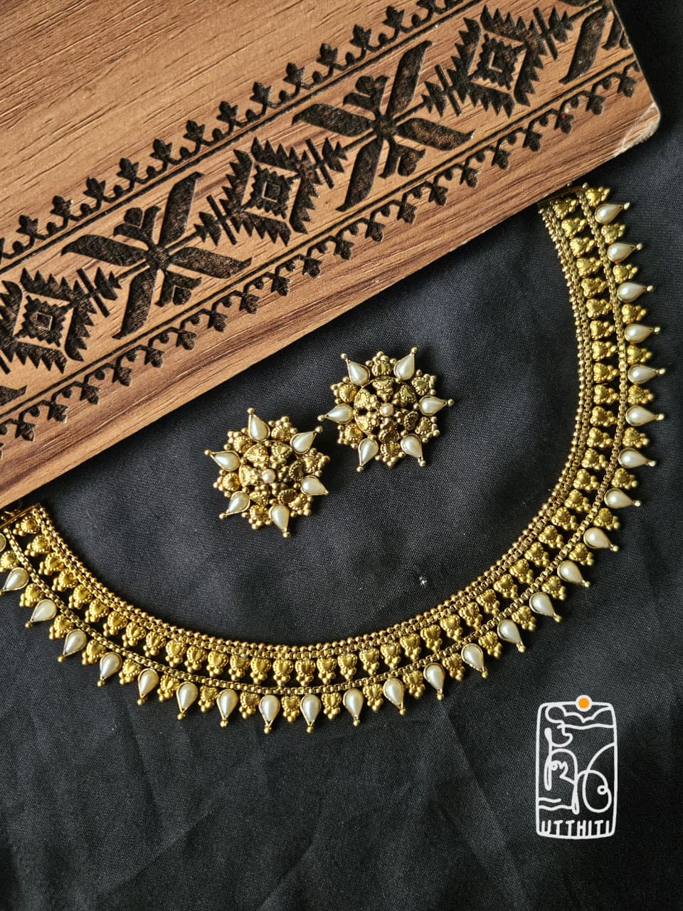 Handcrafted Antique Pearl Teardrop Choker Set with teardrop pearls and antique gold finish — elegant, regal, and timelessly beautiful.