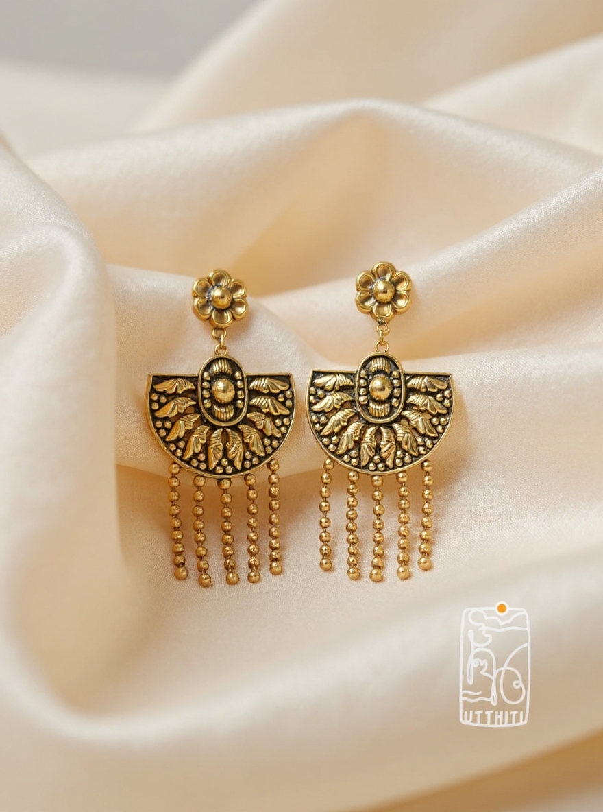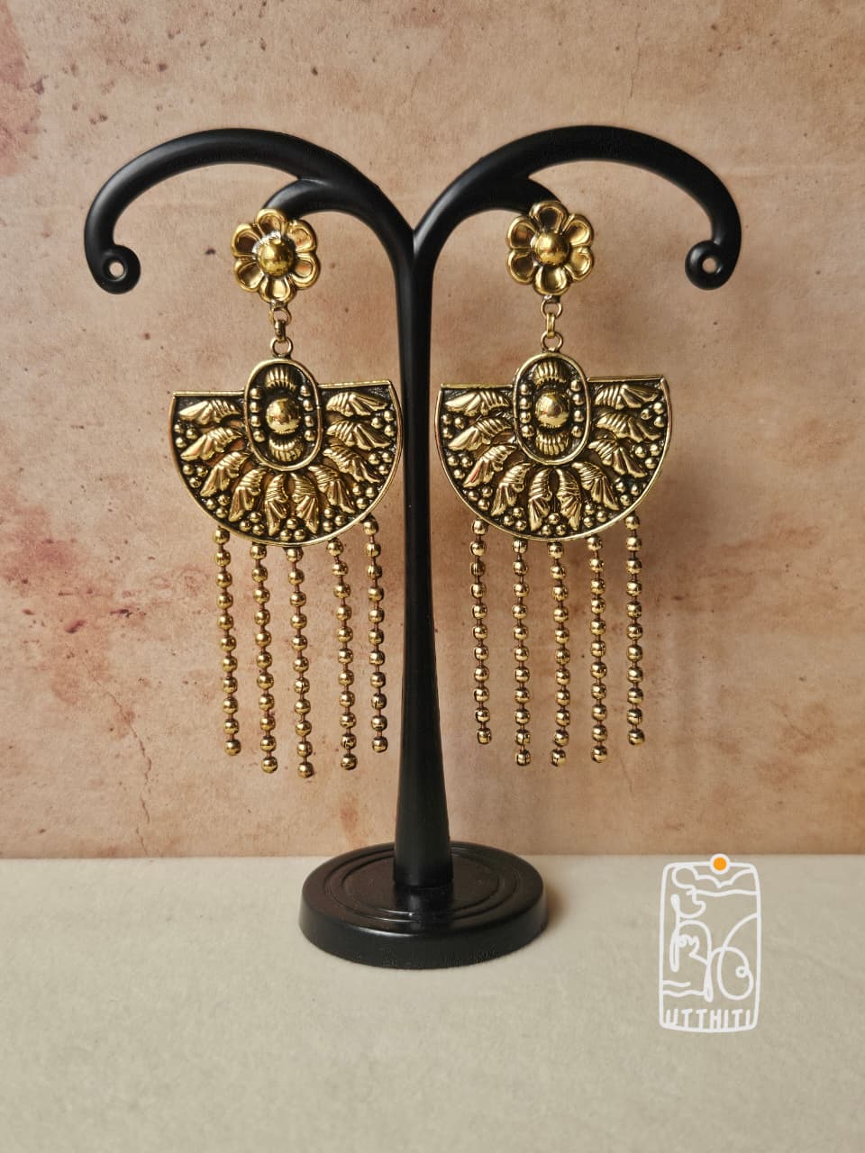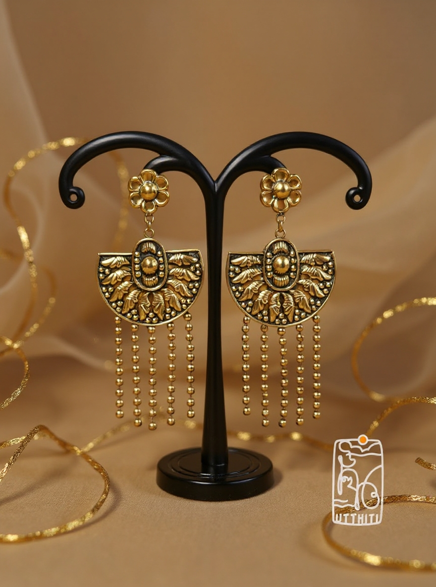 Command attention with Cleopatra’s Crozier, a statement piece inspired by the regal elegance of ancient queens. Handcrafted with meticulous detailing, this earring set embodies power and sophistication — featuring sculpted motifs, antique gold tones, and a bold, structured silhouette reminiscent of royal Egyptian artistry.