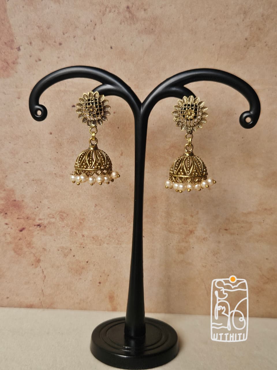 The intricate floral top seamlessly flows into a classic jhumka dome, adorned with fine detailing and a soft antique gold or silver polish. Lightweight yet striking, it’s perfect for weddings, festive occasions, or everyday ethnic wear. The design captures timeless femininity — bold yet graceful, traditional yet effortlessly modern.
