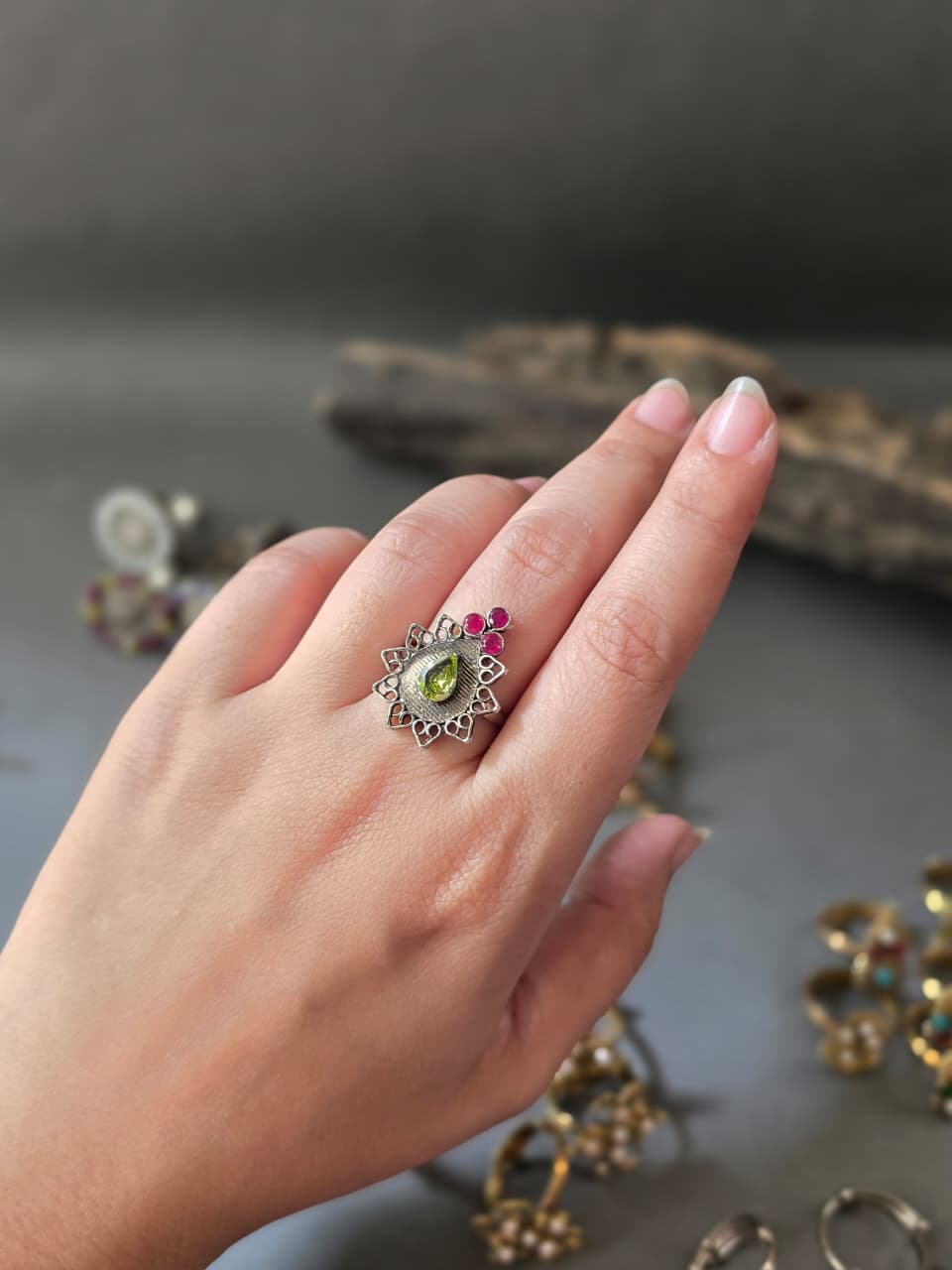 Handcrafted ethnic ring with a teardrop gemstone and ornate floral filigree. Adjustable, elegant, and perfect for daily wear or festive occasions.