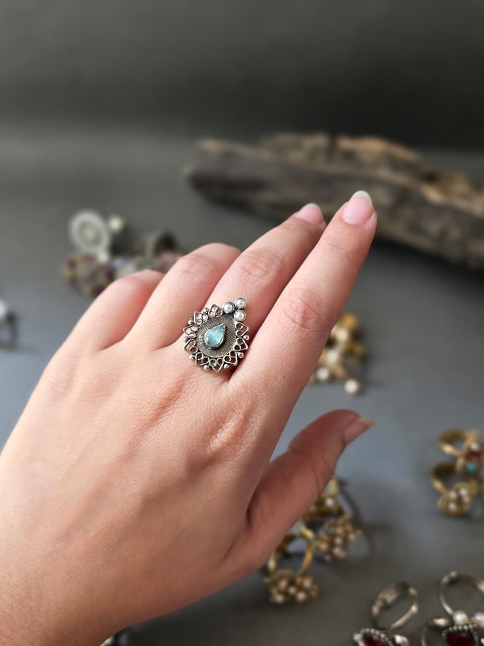 Handcrafted ethnic ring with a radiant teardrop gemstone and detailed openwork design. Lightweight, adjustable, and perfect for elegant everyday or festive wear.