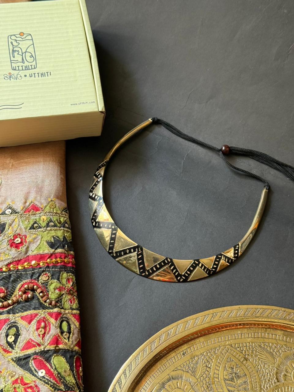 A sleek gold-tone collar choker with intricate patterns. Perfect for elevating both traditional and modern outfits with a bold, elegant touch.