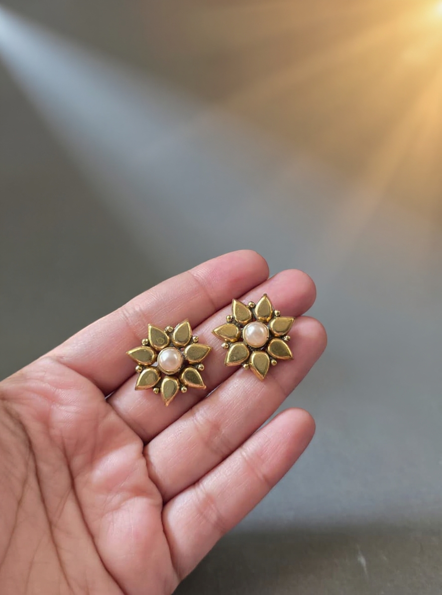 The Golden Flower Ear Stud V3 captures the allure of traditional beauty with a bold, vintage touch. Designed with a matte antique gold finish, this pair features a ruby-red stone center that adds a vibrant contrast to the soft, textured petals. The result is a piece that feels regal yet wearable — perfect for ethnic celebrations or festive gatherings.