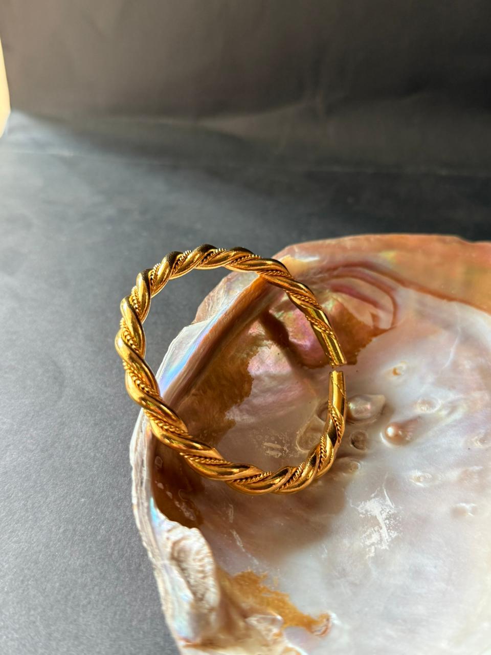 A polished golden metal bracelet with a sleek design and comfortable fit for everyday wear.