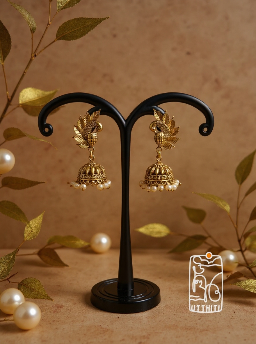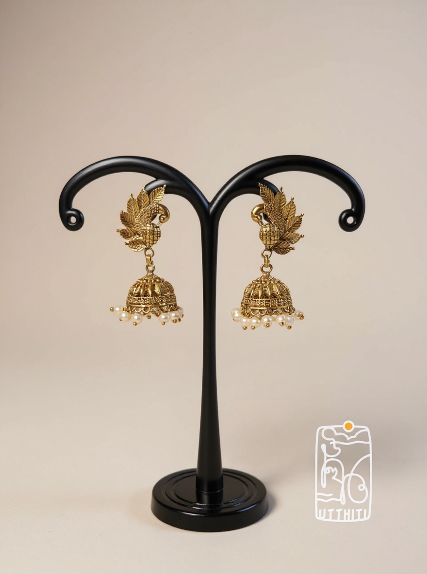 Handcrafted Peacock Jhumka with intricate peacock motifs and antique gold finish — elegant, lightweight, and perfect for festive wear.