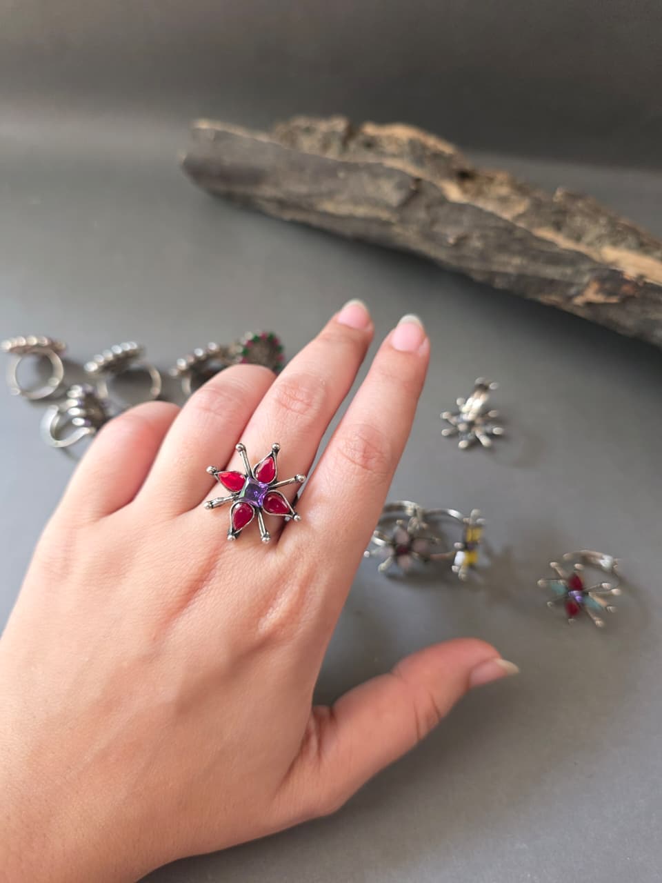 Stunning celestial-floral ring with a sparkling central gemstone, multi-layered starflower motif, and filigree accents. Adjustable and versatile.