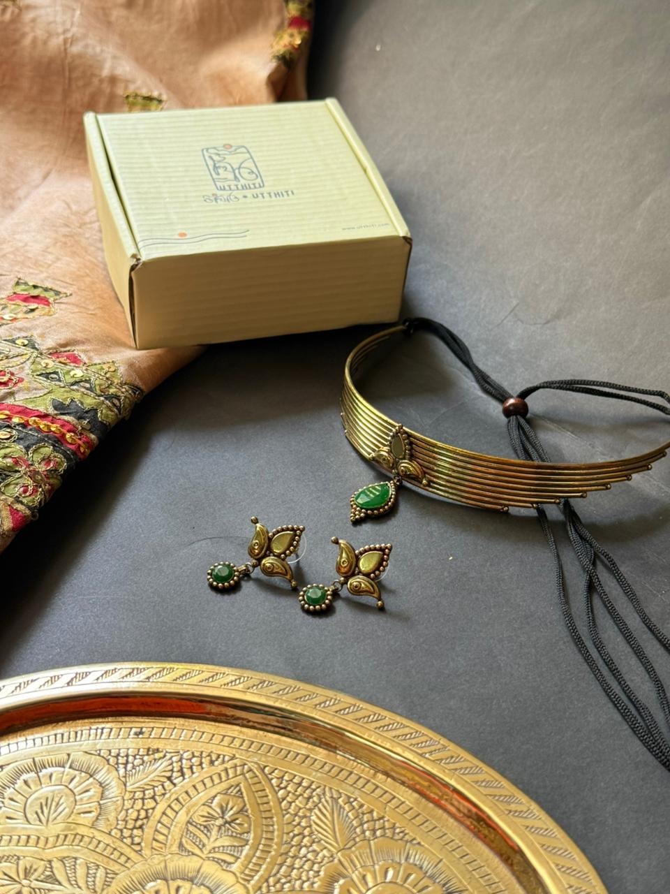 The choker sits beautifully along the neckline, enhancing your natural grace while adding a regal touch to your ensemble. Paired with matching statement earrings, the set creates a harmonious and eye-catching look. Its lightweight construction ensures all-day comfort, while the adjustable fastening provides a secure and personalized fit for different neck sizes.