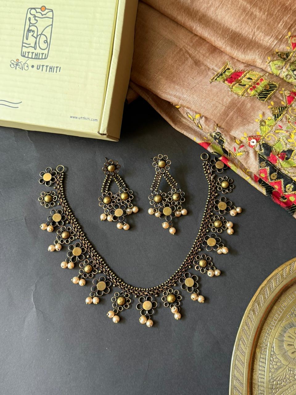 The set typically includes a matching necklace and earrings, both finished in a rich antique tone that complements a wide range of traditional and fusion outfits. Lightweight yet eye-catching, it offers a perfect balance of comfort and statement style. The floral design symbolizes grace and femininity, making it an ideal accessory for weddings, festive celebrations, or elegant evening gatherings.
