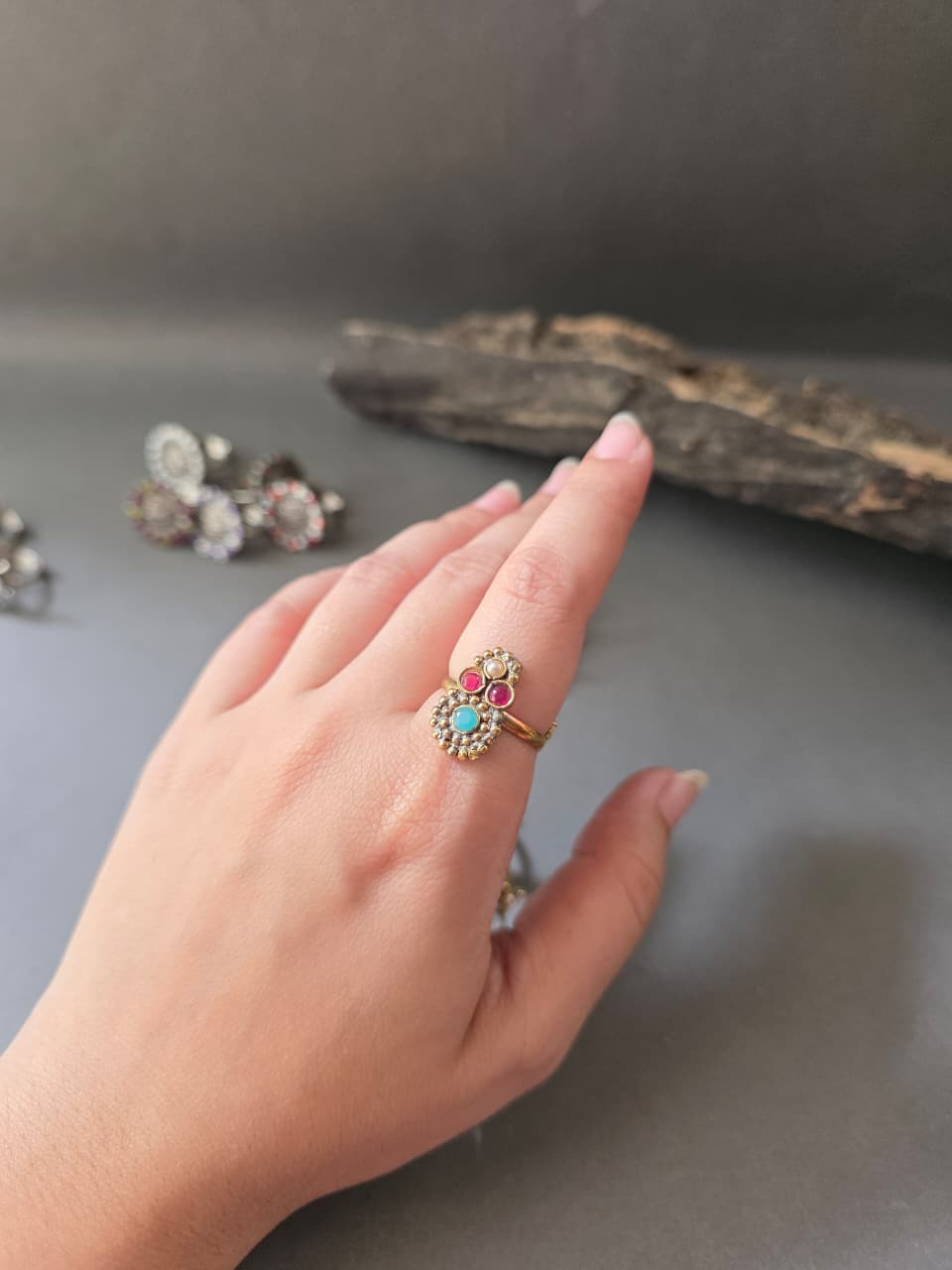 Elegant floral-inspired ring with three sparkling gemstones in a delicate cluster. Adjustable, lightweight, and perfect for daily or festive wear.